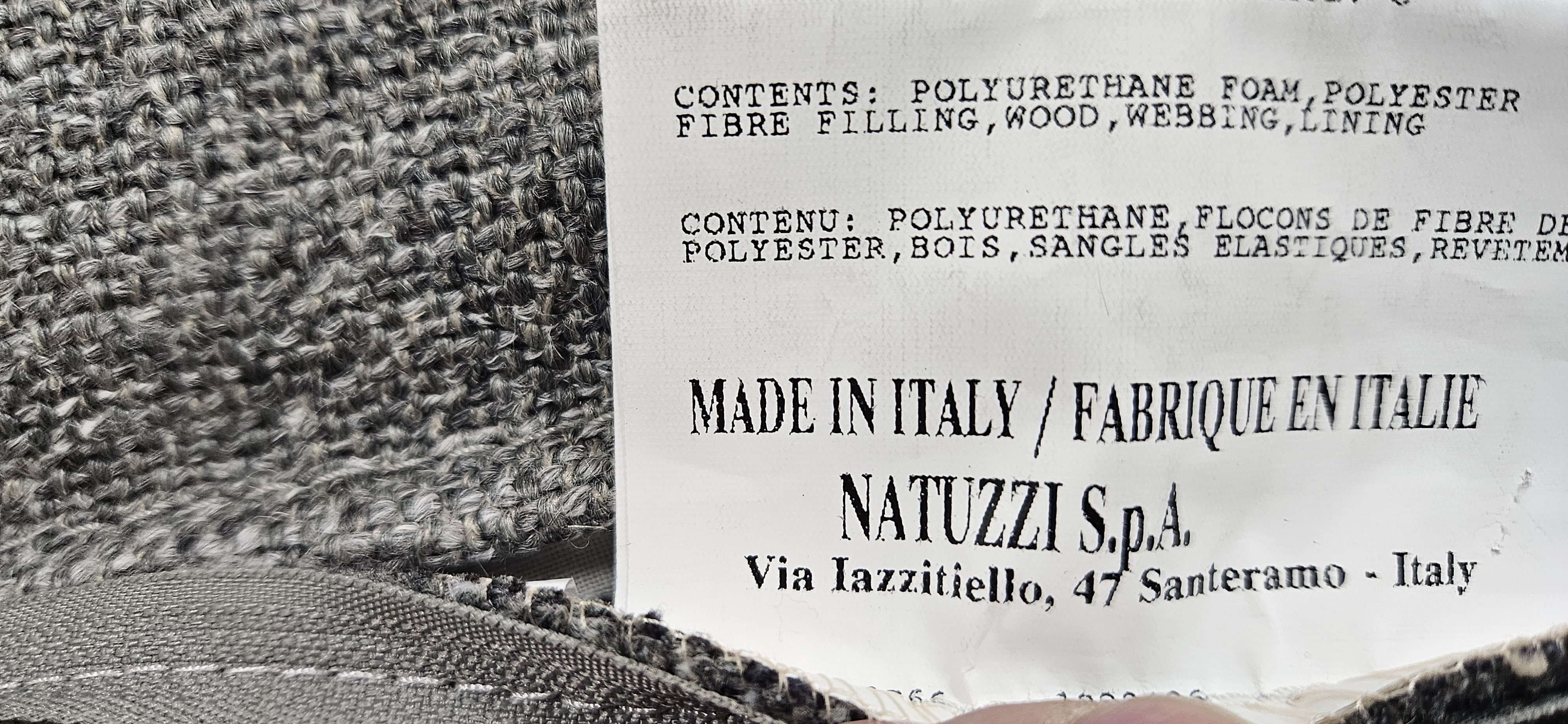 Sfinge is commonly listed as a Natuzzi Editions performance fabric and described by retailers as water repellent and easy to wipe clean.