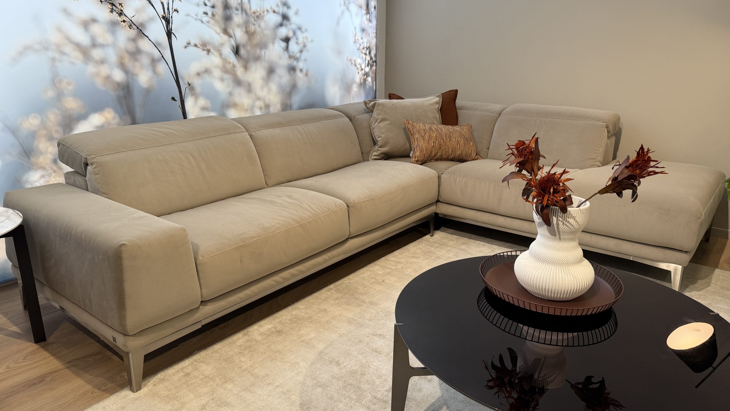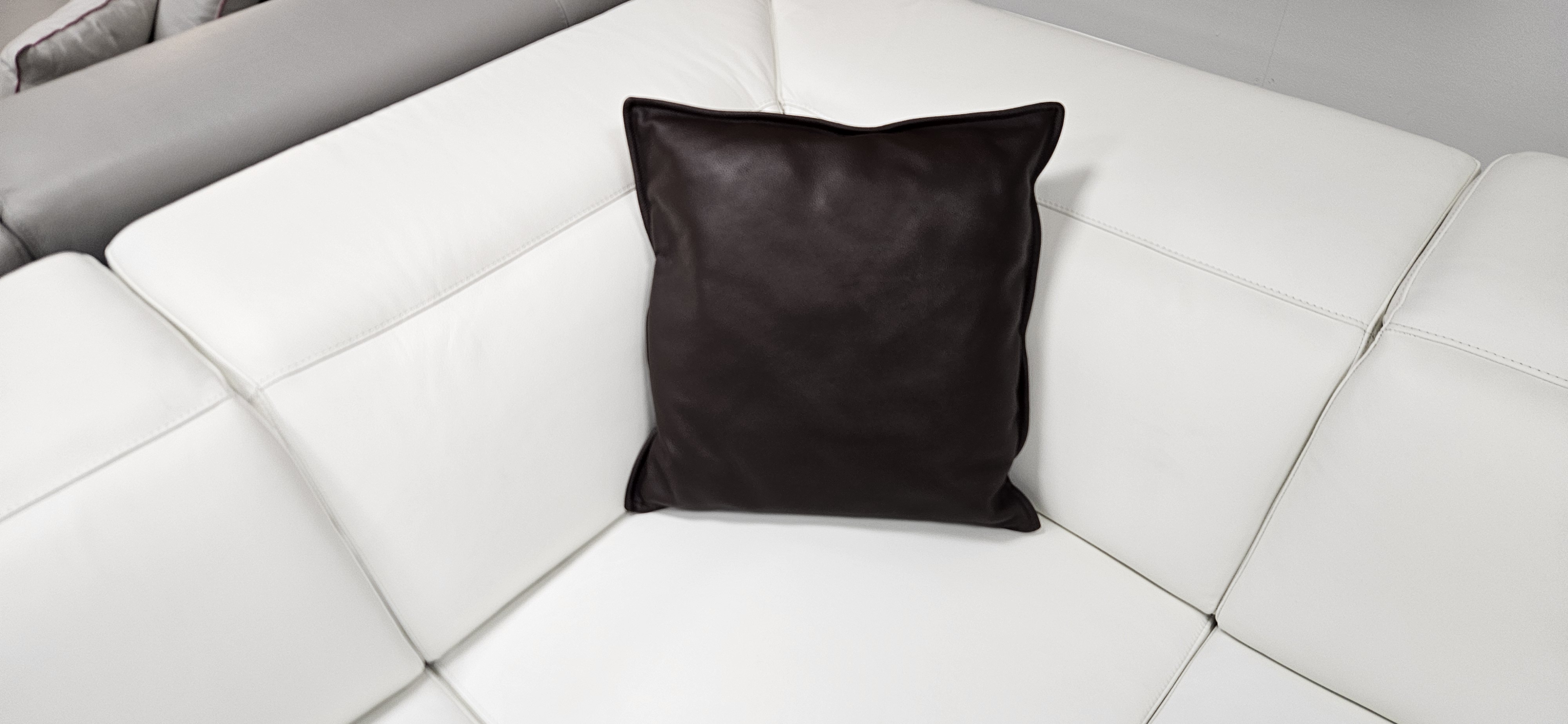 In the small corner layout with an arm at each end, the footprint is approximately 225cm by 269cm, with a depth of about 106cm, and an adjustable back height around 77cm to 99cm, plus a seat height of about 45cm. It is a great option when you want a corner group that fits neatly without overpowering the space, and this one is ready for immediate delivery from a major Natuzzi store display.