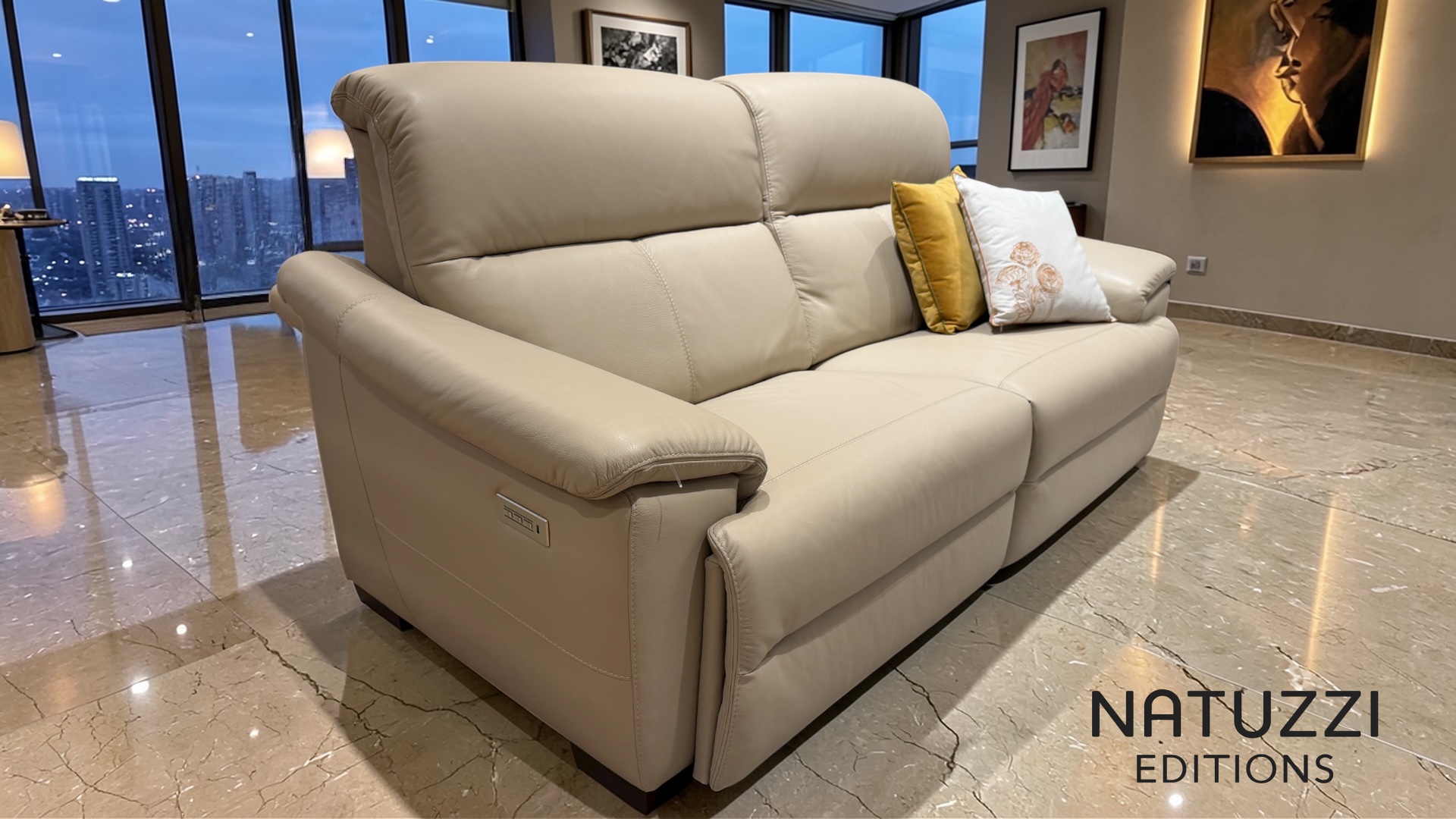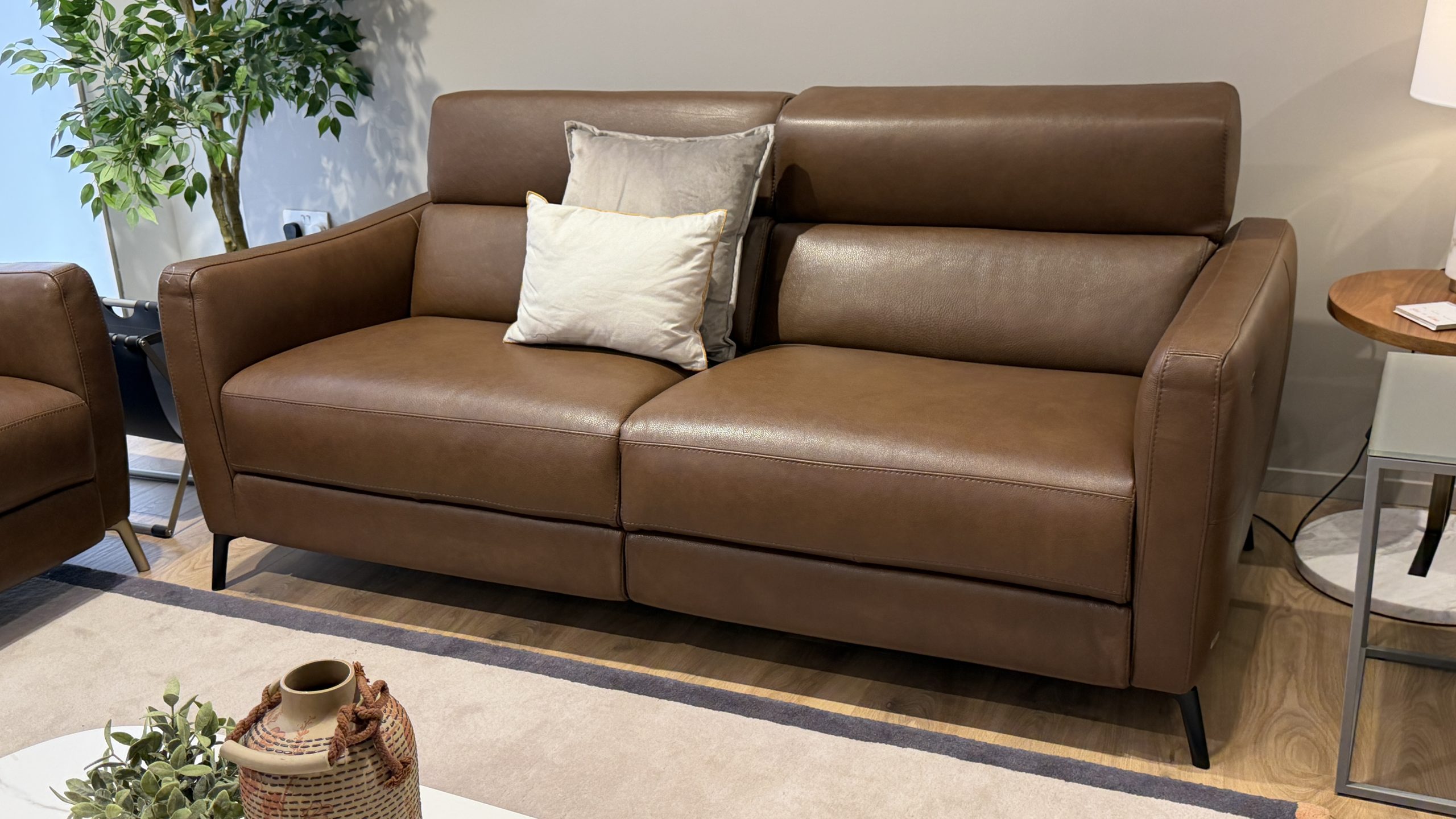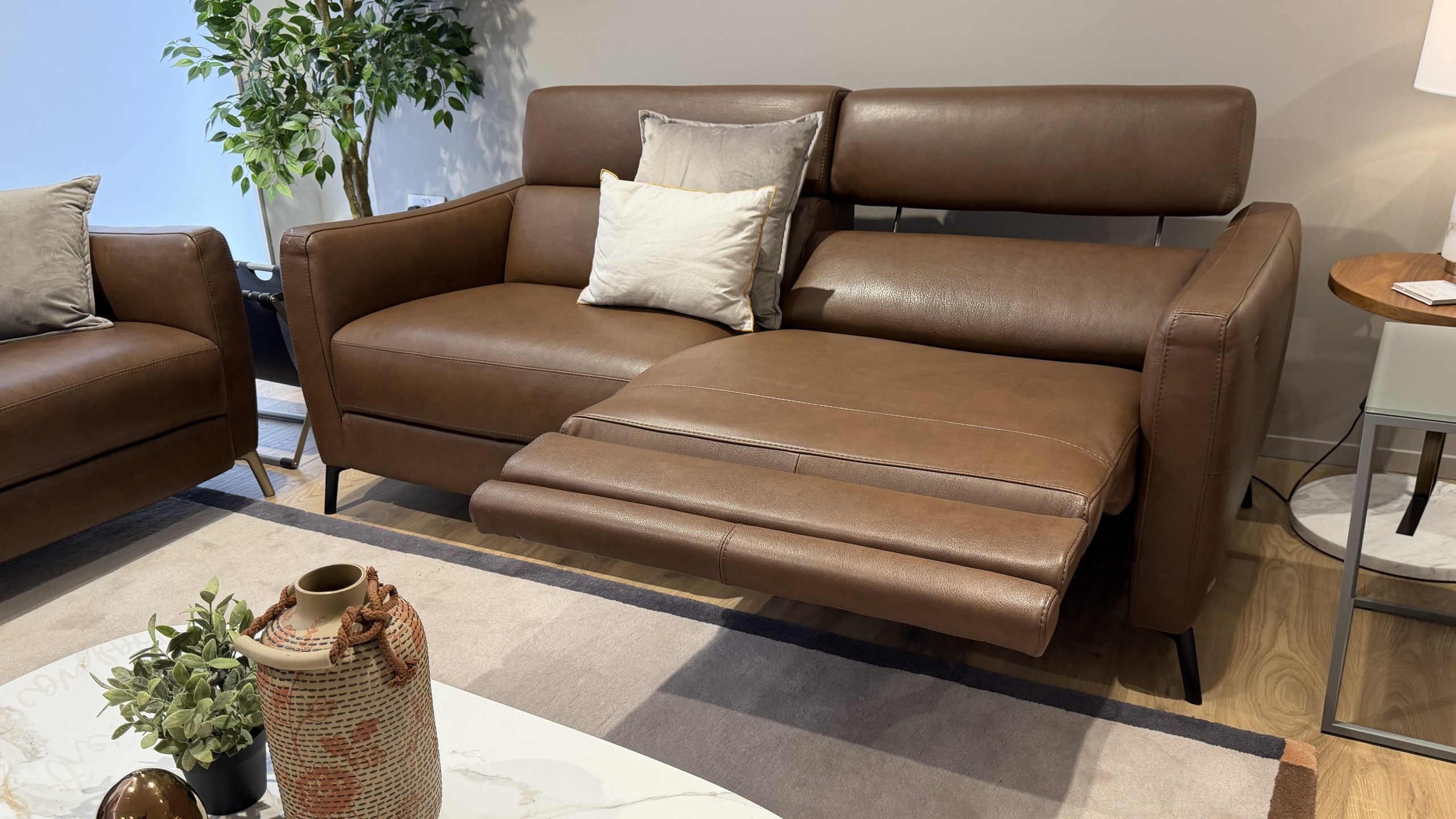 NEW UPDATED version NATUZZI EDITIONS PORTENTO. 15 LeMans Premium taupe leather on this three seater with powered headrests and reclining along with a fixed two seater sofa with pull up ratchet headrests. The seat foam is improve firmer composition on this newer ultra modern and contemporary designer sofa suite from the new 2025 collection.£5999 New packed with full guarantee.
