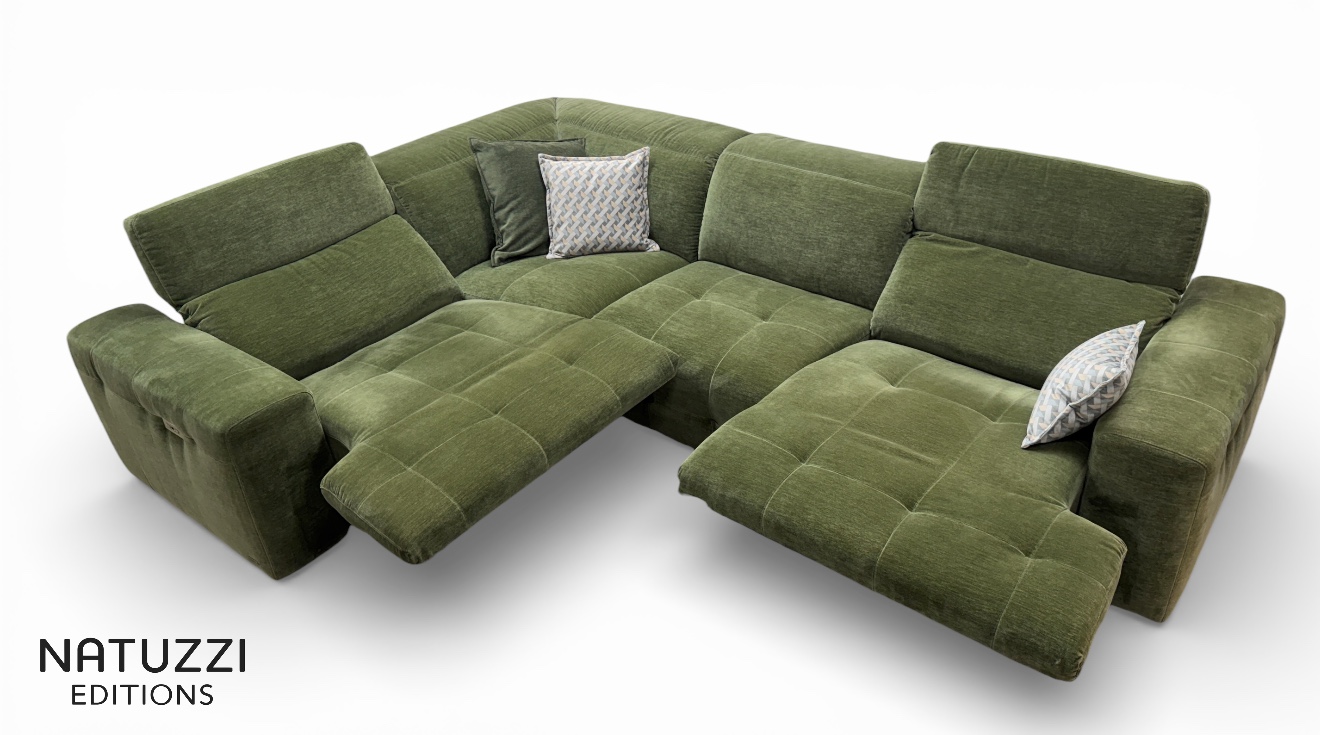 Natuzzi Editions Eleganza Power reclining corner sofa in soft grey Natuzzi Sfinge wipeable fabric with contrast green leather leather chair £3924 , the corner measures 300cm x 220cm and can be left hand facing or right hand facing.