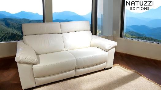 Natuzzi Editions off-white leather premium LeMans cowhide protected leather with power recliner on both sides. High back super comfortable and a very low price special offer sale ex display item that was in a Natuzzi store.
