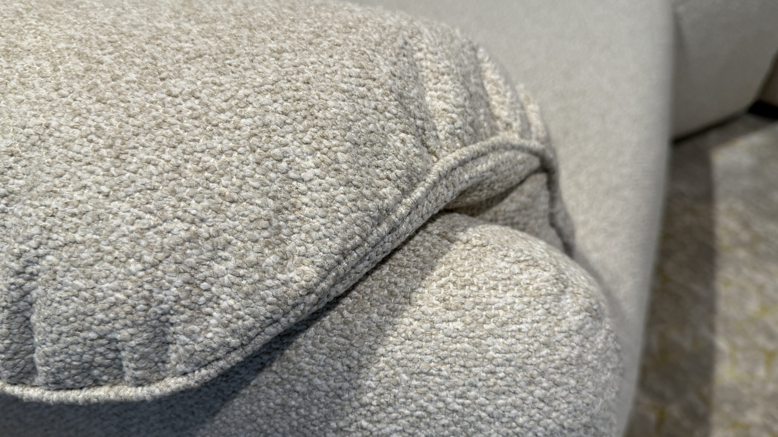 The Natuzzi Editions Curioso C107 is a compact corner sofa with a smart, modern profile and a genuinely cosy feel. This ex store display is upholstered in a beautiful oat coloured, Chanel style textured fabric that looks warm and current, and the Curioso design keeps the room feeling open while still giving you proper lounge comfort and supportive seating. Versions 016 + 076 +002.