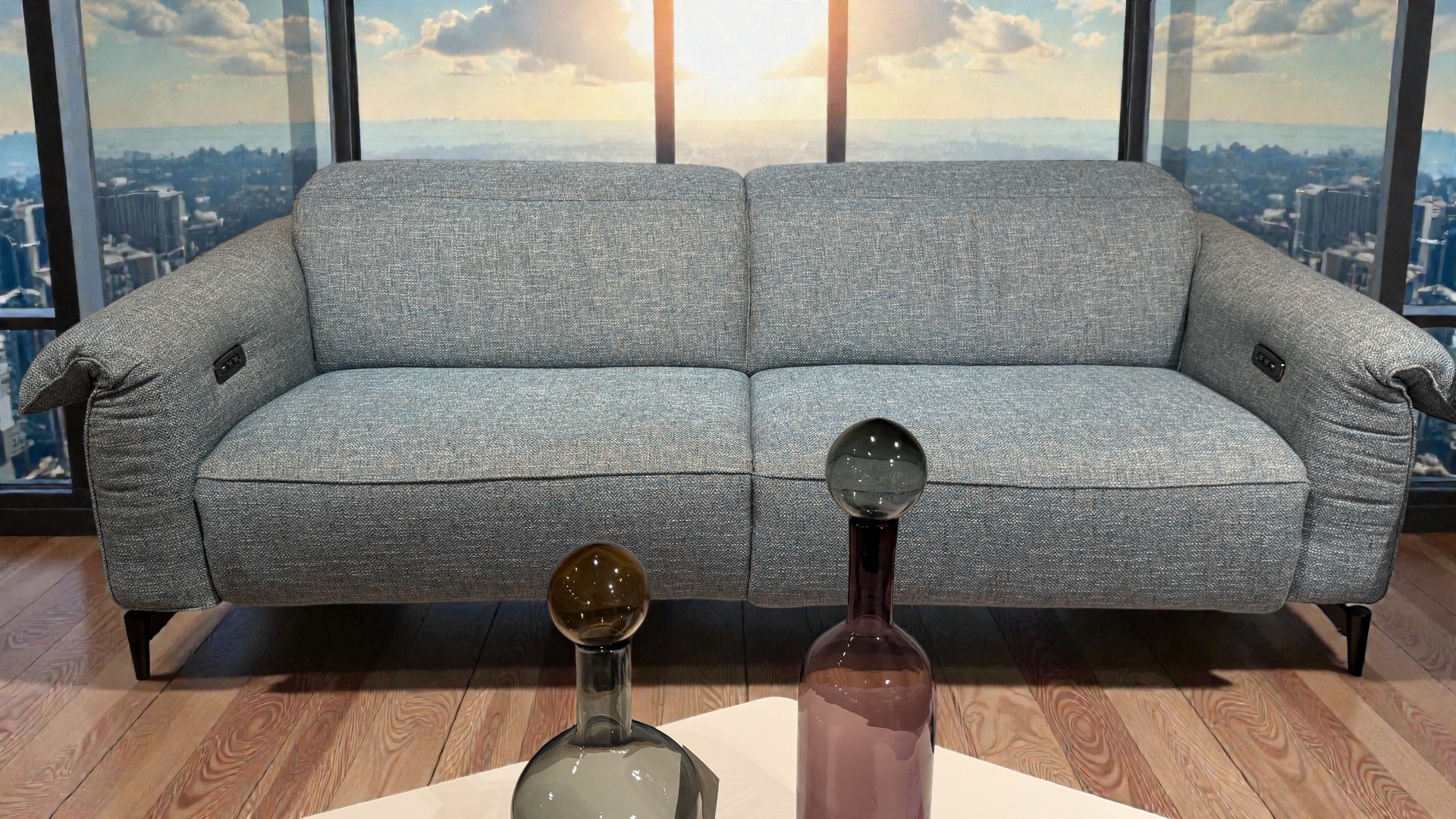 Natuzzi paradiso power reclining cinema sofa upholstered in beautiful mid grey soft Italian protecta leather.